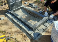 Для гарантии устойчивости памятника ему требовалось придать жёсткость каркаса по периметру. Бетонное основание смотрелось бы непривлекательно, поэтому с согласия клиентки мы решили уложить вокруг памятника один ряд брусчатки. Первым этапом работы был точный замер цветника с надгробьем.